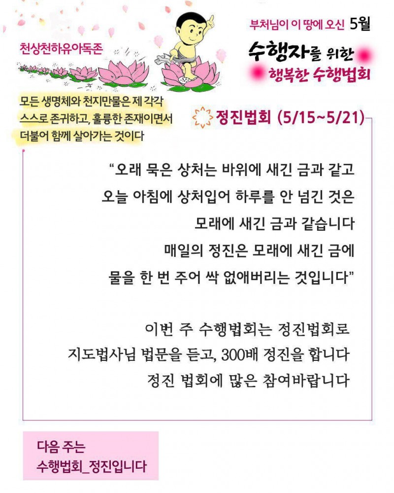 이번 주 수행법회는 정진법회로 지도법사님 법륜스님의 법문을 듣고, 300배 정진을 합니다.